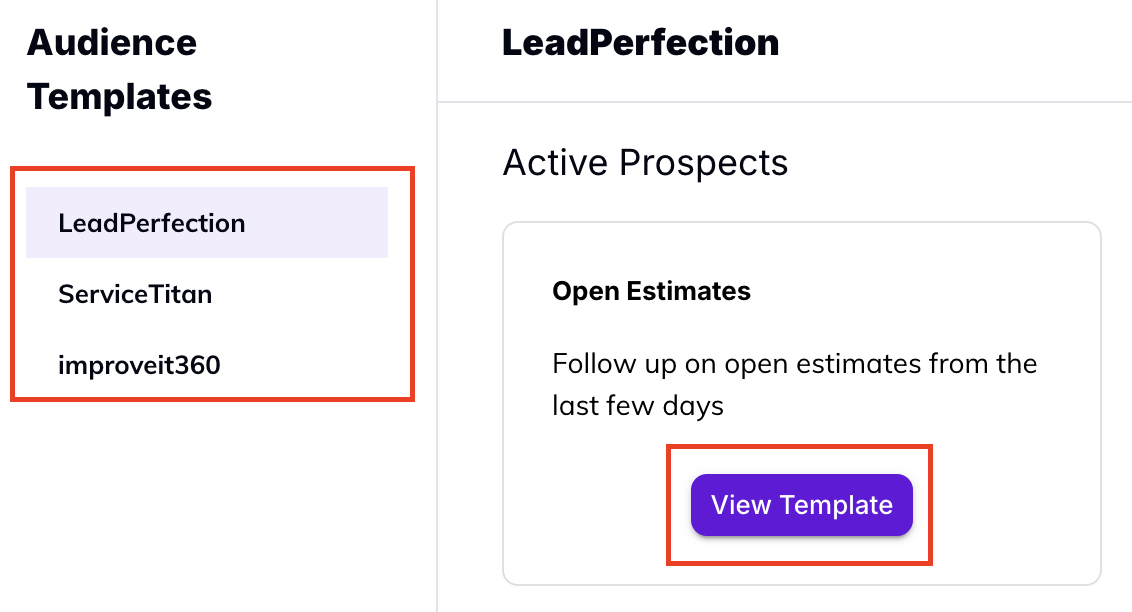 Audience templates are pre-built Audience Builder queries covering our most popular use cases and CRMs. Currently the template gallery covers ServiceTitan, LeadPerfection, and improveit360 with more to come.How do I use an audience template?