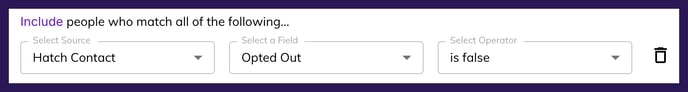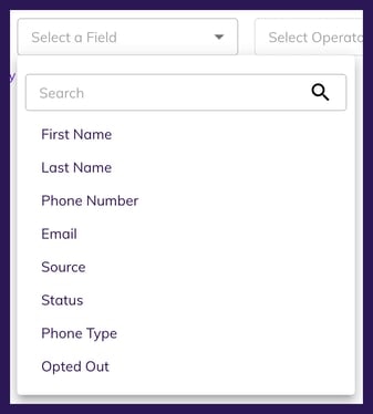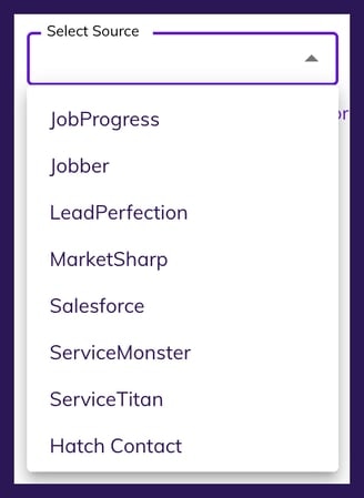 When you click the Source Picker drop-down, you will see a list of all data sources that at least one contact has in your Hatch account. Hatch Contact will always exist and will allow you to search for things like Name, Phone, Email, and other data that is associated to a Hatch Contact.