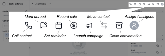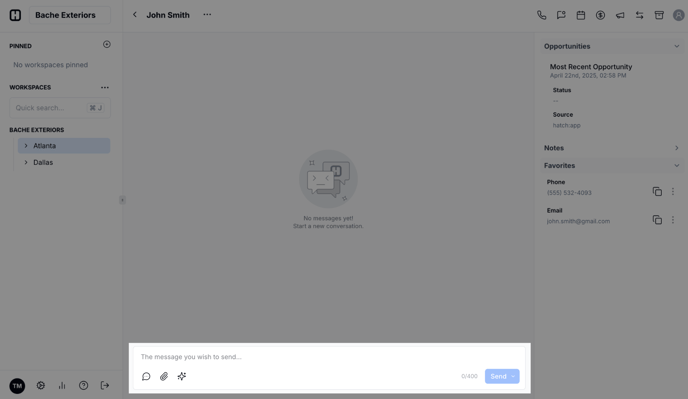 - Change contact method: The first symbol shows which medium you’re using to communicate with this contact. By default, your responses in Hatch will come from whichever medium your contact has used to contact you, but you can also switch in the middle of a conversation. A speech bubble means you’re drafting a SMS message, a mail icon means you’re writing an email, and the Yelp logo means you’re going to send a message via Yelp.