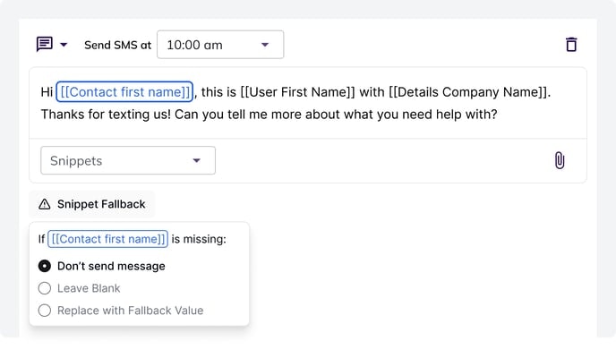 With Snippet Fallbacks, you can configure certain Snippets to change behavior if the information it’s looking to reference in a message is missing. In particular, it can:- Become blank