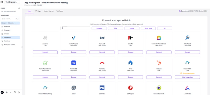 The Hatch App Marketplace is where you browse, install, and configure integrations — all from inside Hatch. To access it, click Integrations in your workspace sidebar. From there you can:- Search for integrations by name