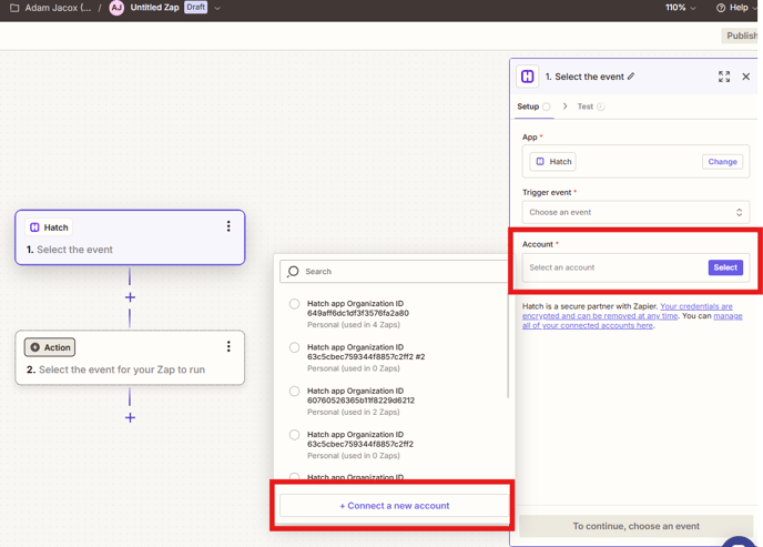 Once a Hatch trigger or action has been selected, you will be prompted to authorize access to Hatch. If you have already authorized access to your Hatch org, you can select it from a drop-down. Otherwise, connect a new account. You may authorize connections to more than one Hatch org.