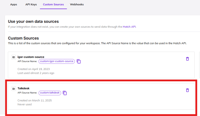 - In the “source” field, hand-write the custom source that you setup in Hatch earlier. From our example, this was “custom:talkdesk” so we will plug that value in.