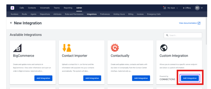 In this step you will configure the Hatch url where Talkdesk will send data to. Talkdesk has a detailed explanation on this here. Head to your Talkdesk account, and add a custom integration.\