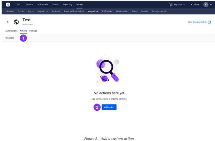 Now that we have a connection, we can configure custom actions that utilize that connection. Talkdesk has a detailed article here, but we will cover the Hatch specific configurations. Click Action and then Add Action\