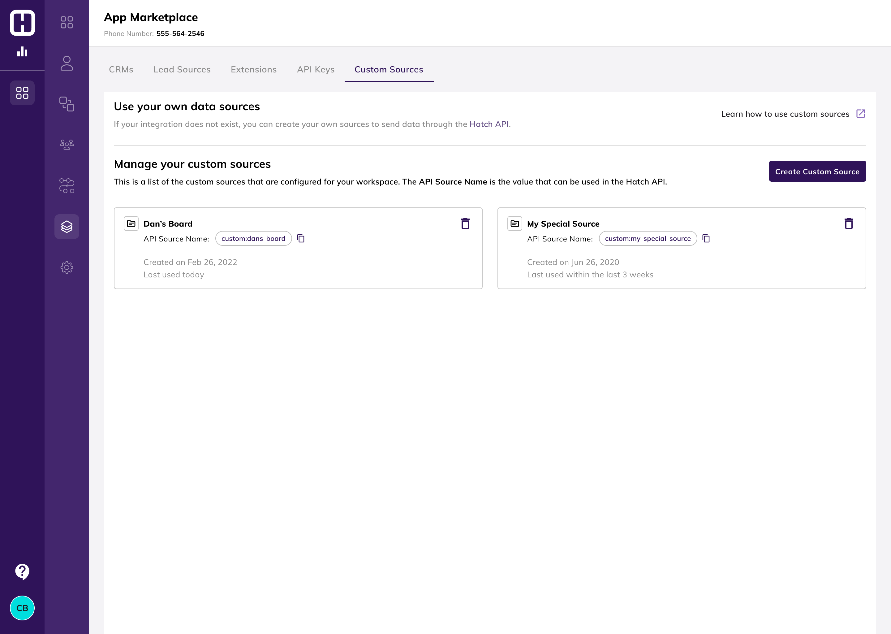 When you send contact data into Hatch, you are required to provide a valid source**** value in the body of the request. You can view and manage your custom sources in the App Marketplace custom sources tab.
