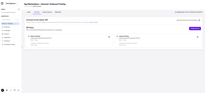 Hatch’s public API is organized around REST. Our API has predictable resource-oriented URLs, accepts JSON-encoded request bodies, returns JSON-encoded responses, and uses standard HTTP response codes, authentication, and verbs. Our API uses API keys to authenticate requests. Your API keys carry many privileges, so be sure to keep them secure! Do not share your secret API keys in publicly accessible areas such as GitHub, client-side code, etc.Creating and managing API keys