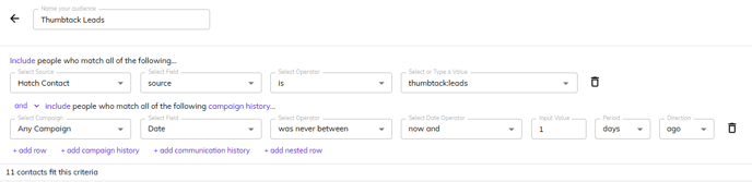 - After the integration has been activated, you will need to setup your audience and campaign workflow to launch your Thumbtack leads into a Speed to Lead campaign. Your audience should look something like this at the most basic level (you can additionally filter by different Thumbtack parameters such as business name, request category, lead type, etc):